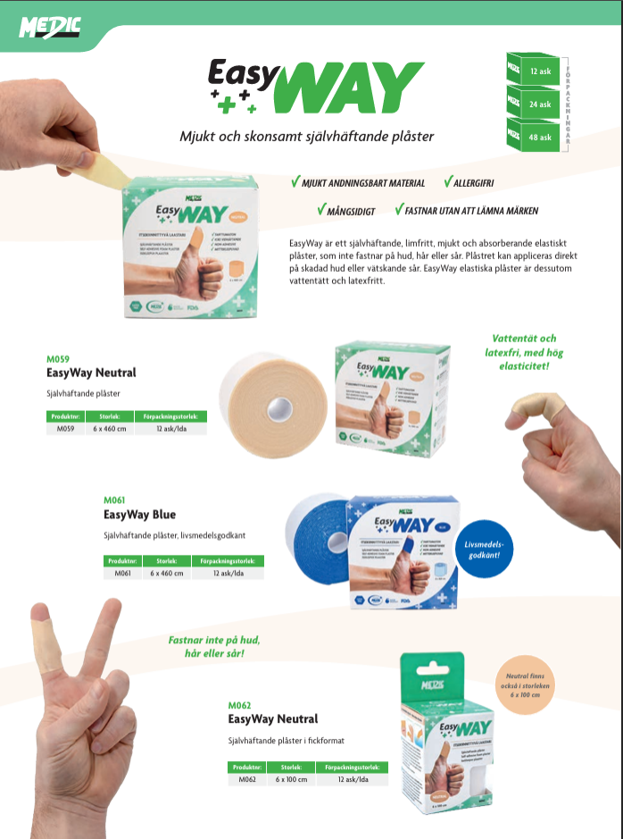 EasyWay är ett självhäftande, latexfritt, mjukt och absorberande elastiskt bandage som inte fastnar på hud, hår eller sår. Idealisk för mångsidig användning, den erbjuder ett skonsamt och andningsbart skydd samtidigt som den är vattentät. Bandaget kan appliceras direkt på skadad hud eller gråtande sår och lämnar inga märken när det tas bort. Finns i olika storlekar och förpackningsalternativ, den är allergivänlig och lämplig för användning i både medicinska och livsmedelsrelaterade miljöer.